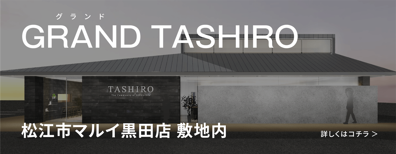 島根県松江市・出雲市、鳥取県米子市に展開する美容室TASHIRO。ヘア・エステ・ネイル・まつエク・コスメ・美容機器取り扱い。“ラグジュアリー感・信頼の技術”の本店CERO(松江市京みせ)“アットホームと安心”の春日(松江市春日町)“オシャレで最新”のAR(松江市田和山エリア)“カラー技術が定評”のIZUMO-在-(出雲市ゆめタウン東隣、マリエやしろ横)“お客様に寄り添う店”IZUMO-白-(出雲市枝大津町)“洗練された技術”のTASHIRO YONAGO(米子市長砂町)の6店舗を構える。
